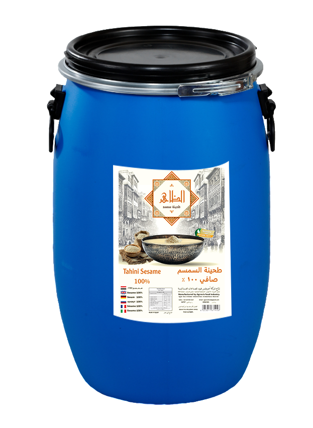 عبوة طحينة الظاهر 50 كجم مصنوعة من أجود أنواع السمسم الطبيعي 100% بطعم غني وقوام ناعم. عروض خاصة للمطاعم وتجار الجملة. اكتشف الطعم الأصيل بجودة مصرية عالية.